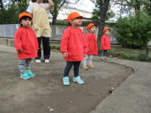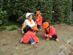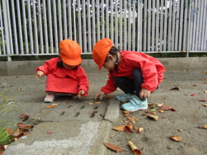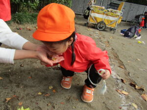 落ち葉が沢山落ちており、どんぐりも発見するお友達もいて