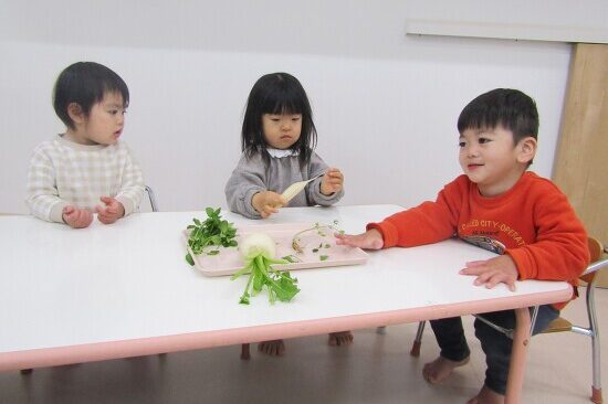 今日は食育活動がありました。 なのはな農園で採れた初めての野菜です。 とんぼ組さんが張り切って収穫してくれました。 大きなモロヘイヤにみんなびっくり! 「こんなに大きくなったね」「今日のおやつに出るの?…