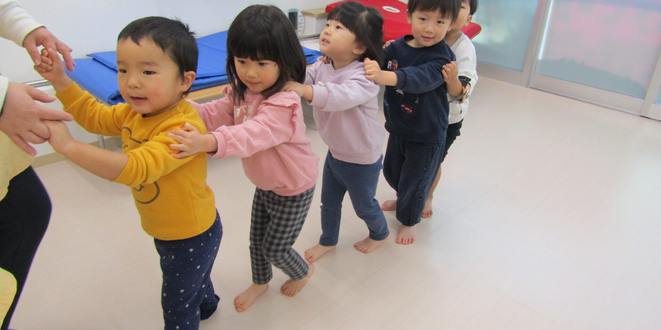 さすがです。綺麗な列が出来た後はみんなで電車ごっこをしました。