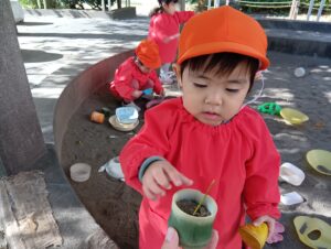 カップに砂を盛り、枝をさしてろうそくに見立てるお友達がいました。