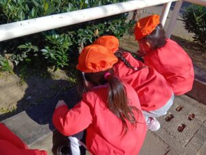探索活動が人気で、こちらは保育者と一緒に木の実を探しているところです。