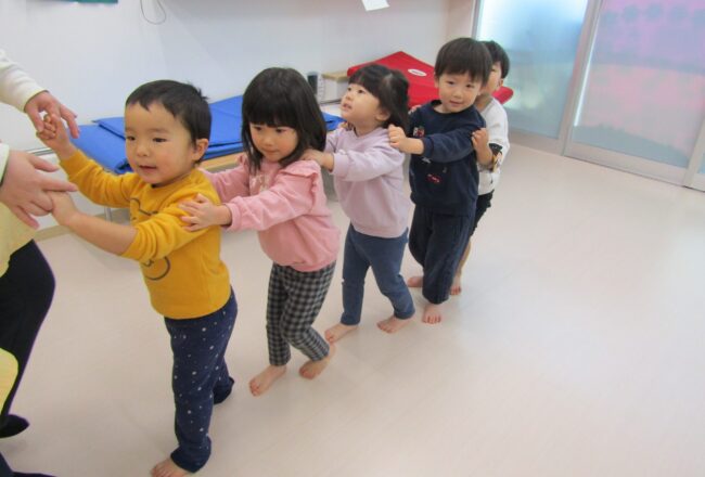 今日は体操教室がありました。 体操の先生が「ここにまっすぐ並ぶよ」と声を掛けると とんぼ組のお友達はすぐにまっすぐ整列する事が出来ました。 さすがです。綺麗な列が出来た後はみんなで電車ごっこをしました。 先生の笛の合図に…